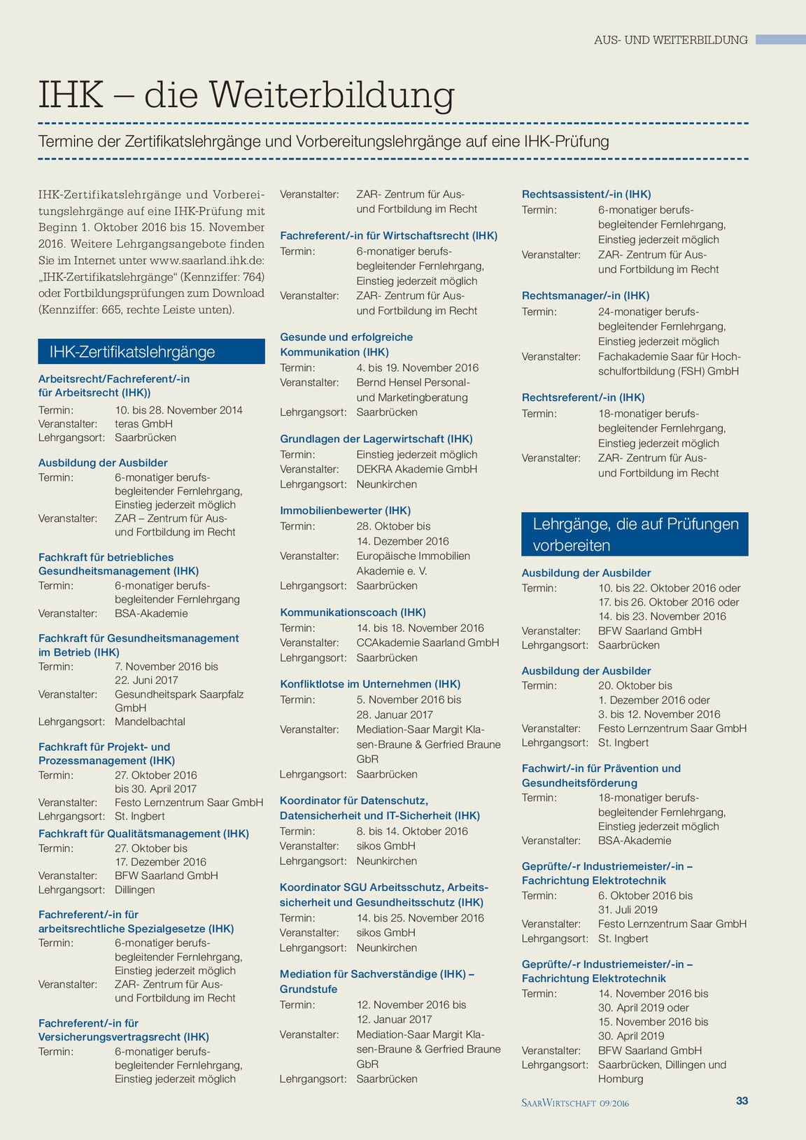Browse Arbeitsrecht / Fachreferent für Arbeitsrecht (IHK) (Certificate) at Saarland chamber of commerce and industry (IHK Saarland) Germany. Jobs für Arbeitsrecht Jobs für Steuerrecht Jobs für Wirtschaftsrecht (allgemein). Der dreitägige Lehrgang „Fachreferent/in für Arbeitsrecht” vermittelt Ihnen umfassendes arbeitsrechtliches Fachwissen für Ihre tägliche Unternehmenspraxis Von der Einstellung bis zur Kündigung von Mitarbeitern über die k onstruktive Zusammenarbeit mit dem Betriebsrat bis zu Compliance und Datenschutzfragen wird ein breites Themenspektrum abgedeckt.