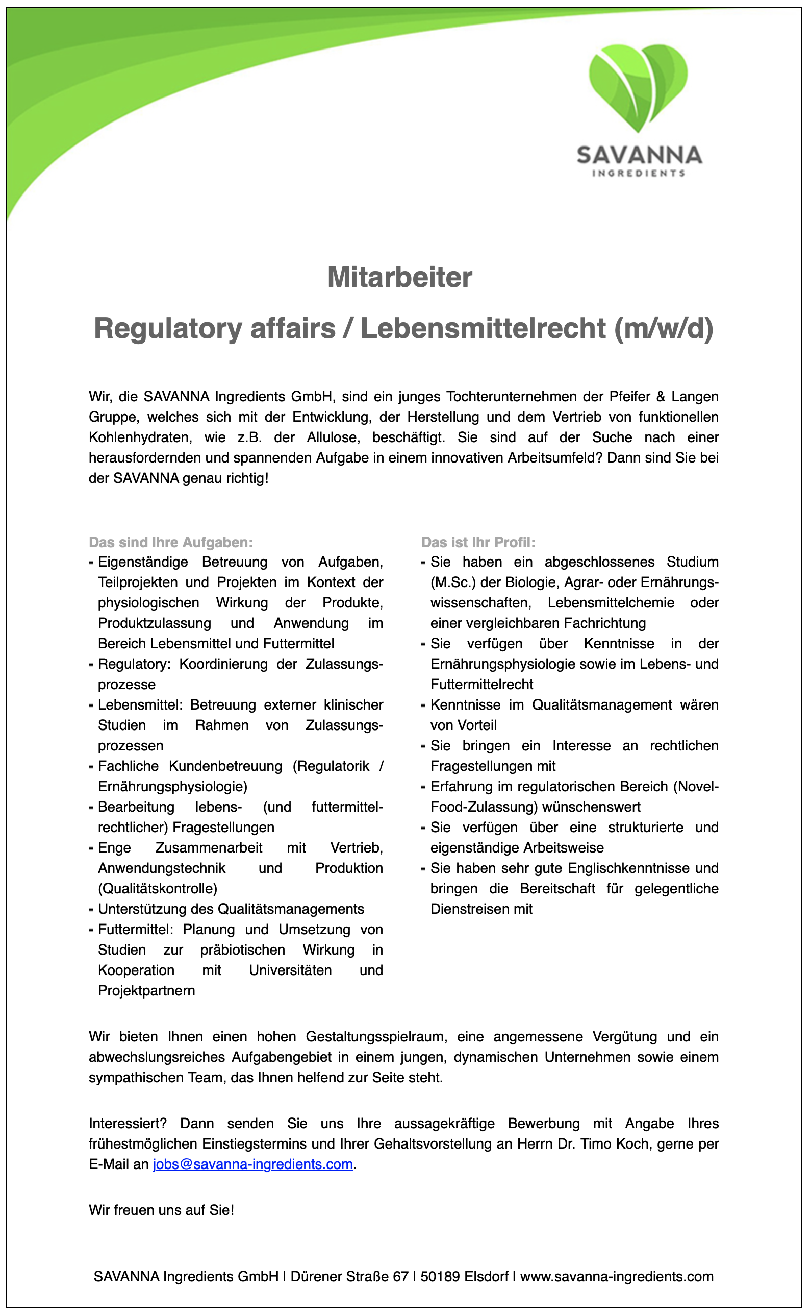 Savanna Ingredients Gmbh Mitarbeiter Regulatory Affairs Lebensmittelrecht M W D