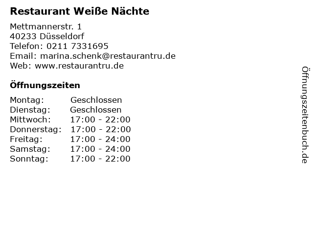 Restaurant, Bar Weiße Nächte, Duesseldorf – photos, on the map Weiße Nächte (Restaurant, Bar) Russian, European cuisine Address Mettmannerstr 1 49 (211) Sign in as restaurateur.