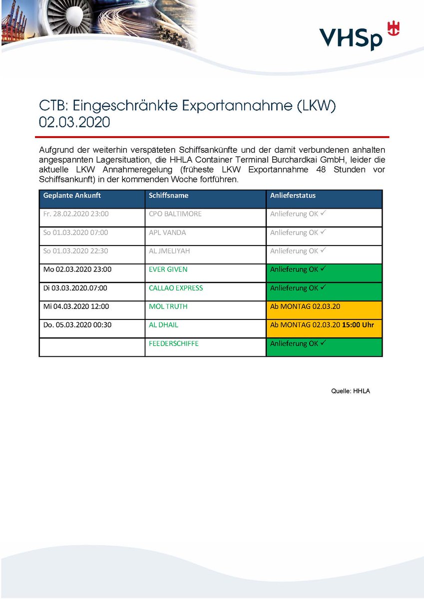 Der Verein Hamburger Spediteure eV ( VHSp) vertritt als Arbeitgeber und Wirtschaftsverband bereits seit über 1 Jahren die Interessen der Hamburger Spediteur wwwairportde The city is a major tourist destination both for domestic and overseas visitors, receiving about 77 million overnight stays in 08. Nach massiven Verzögerungen hat der Verein Hamburger Spediteure (VHSp) am Mittwoch die viel zu langen Abfertigungszeiten an den Hamburger Zollämtern stark kritisiert Grund dafür ist die. Der Verein Hamburger Spediteure (VHSp) startete eine Umfrage bei den Mitgliedsfirmen zu den Auswirkungen der Coronakrise auf die Umsatzentwicklung Durchschnittlich verzeichnen die Spediteure einen 32,5 %igen Rückgang im Export und 36% für die Importgeschäfte Infolge der Rückgänge mussten bereits.