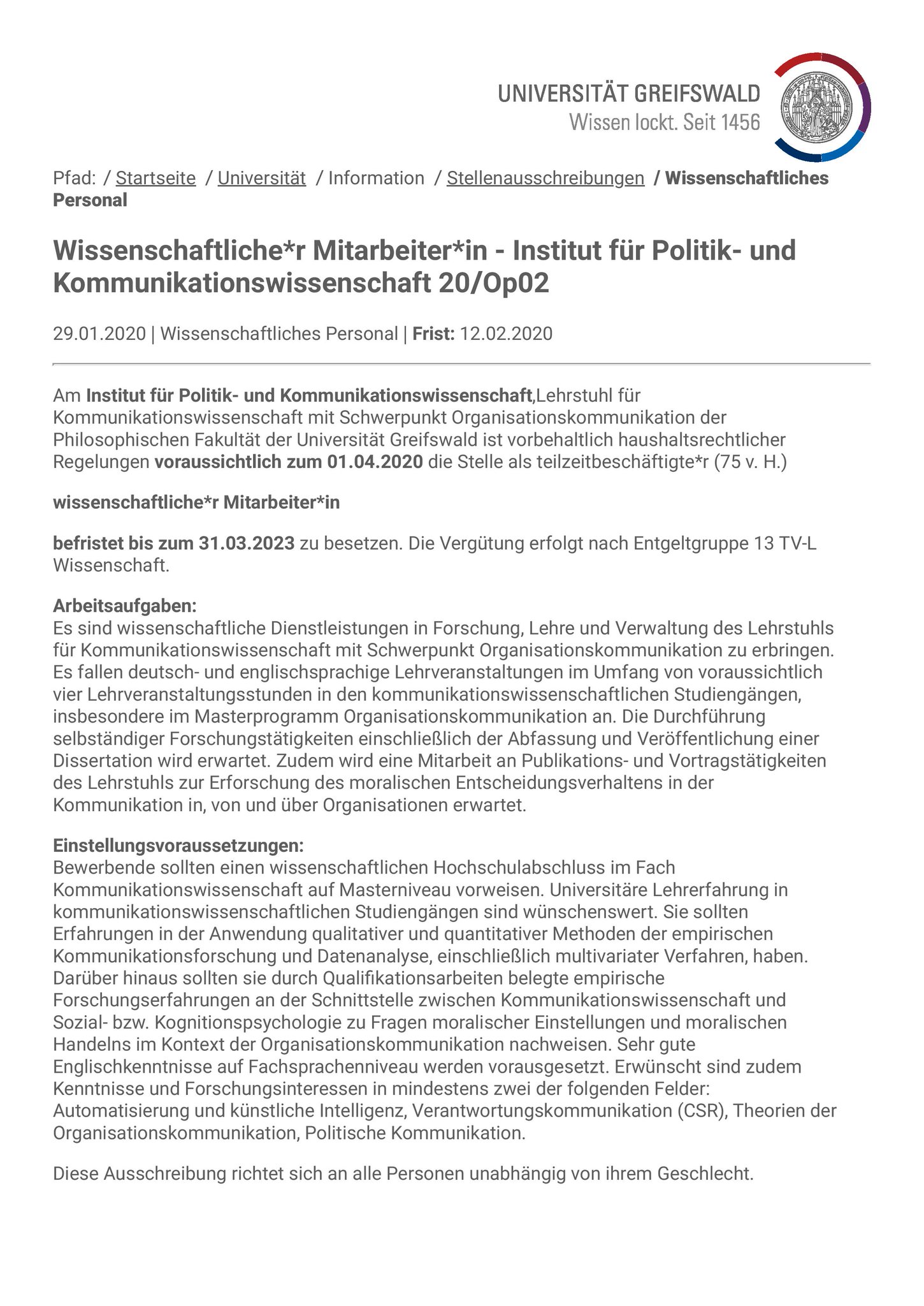Wissenschaftliche Mitarbeiterin am Lehrstuhl für Kommunikationswissenschaft / Schwerpunkt Organisationskommunikation 10 bis 16 Wissenschaftliche Mitarbeiterin bei der Integrierten Qualitätssicherung an der Universität Greifswald (ua Systemakkreditierung;.