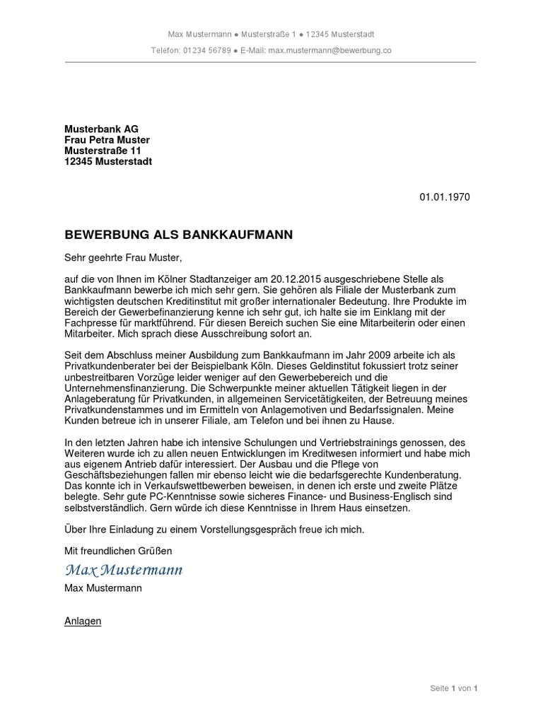Musterbewerbung Um Eine Ausbildung Zum Bankkaufmann