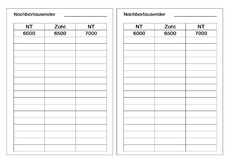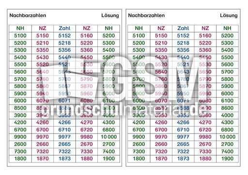 Nachbarzahlen bis 10000. Als Lehrkraft können Sie die Arbeitsblätter zur Ergänzung zum Lehrmaterial an Grund, Volks und Primarschulen einsetzen Eltern können die Übungsblätter zum Lernen in der Freizeit und zum Trainieren in Problemfächern verwenden Die Arbeitsblätter sind für den Einsatz an Schulen und für den privaten Gebrauch kostenlos. Spalten bis Nachbarn, Nachbarzehner, Nachbarhunderter Vorgabe Vorgänger/Zahl/Nachf, nur Zahl selbst Die auf dieser Seite zum Download angebotenen Arbeitsblätter dürfen Sie an andere weitergeben, aber nicht verändern oder verkaufen. 7 600 7 700.
