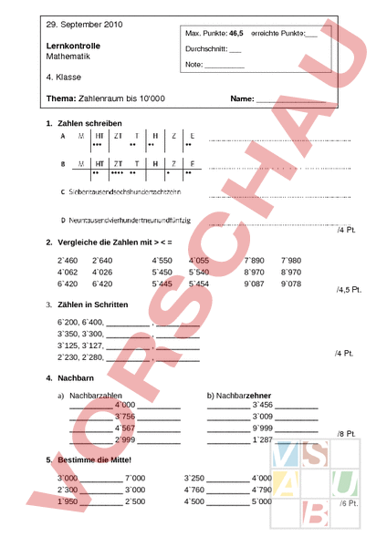 Klassenarbeit Zu Zahlenraum Bis Klassenarbeiten Uberschlag Mathe Klassenarbeiten Mathe Klasse 4