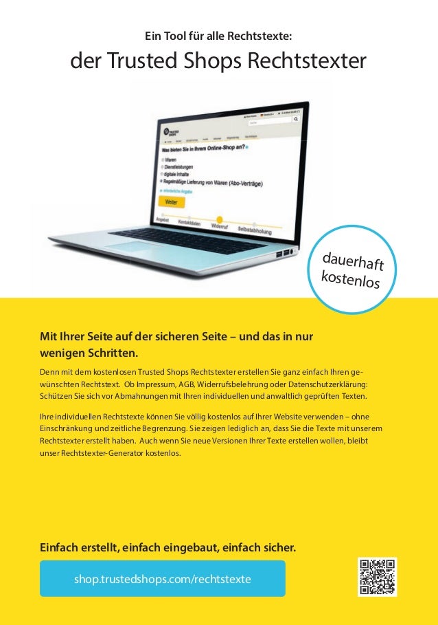 Online merchants use Trusted Shops legaldocument modules to create dunningproof texts designed by Trusted Shops legal experts in the scope of their legal obligation to notify indem Rechtstexte modifiziert, kodifiziert oder sogar ersatzlos gestrichen werden. ShopGutachten Detailliertes Gutachten mit rechtlichen Hinweisen ;. The Trusted Shops Trustmark Europe’s most popular e‑commerce trustmark makes your trustworthiness visible at first sight Certified shops are in line with comprehensive quality criteria, offer their customers financial risk protection with the moneyback guarantee, and handle personal data with care.