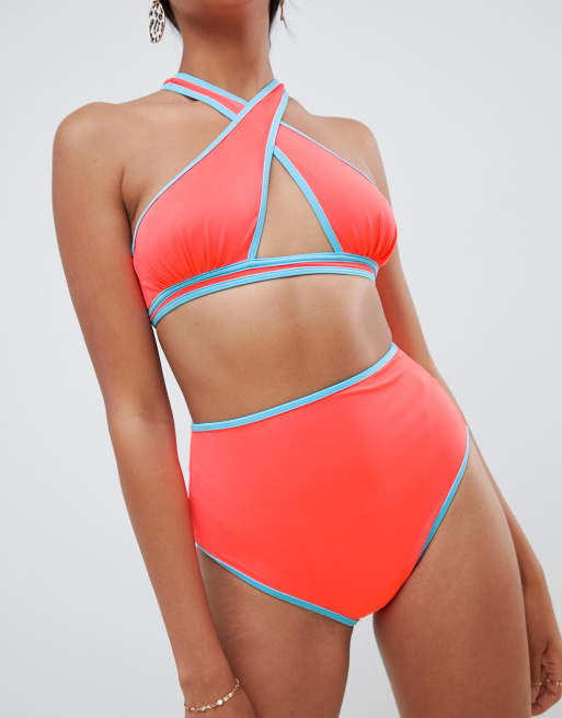 Asos Design Hoch Geschnittene Bikinihose In Neon Orange Mit Kontrastierender Schnurung Asos