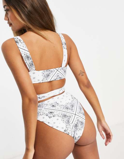 Asos Design Hoch Geschnittene Bikinihose In Weiss Mit Bandanamuster Asos