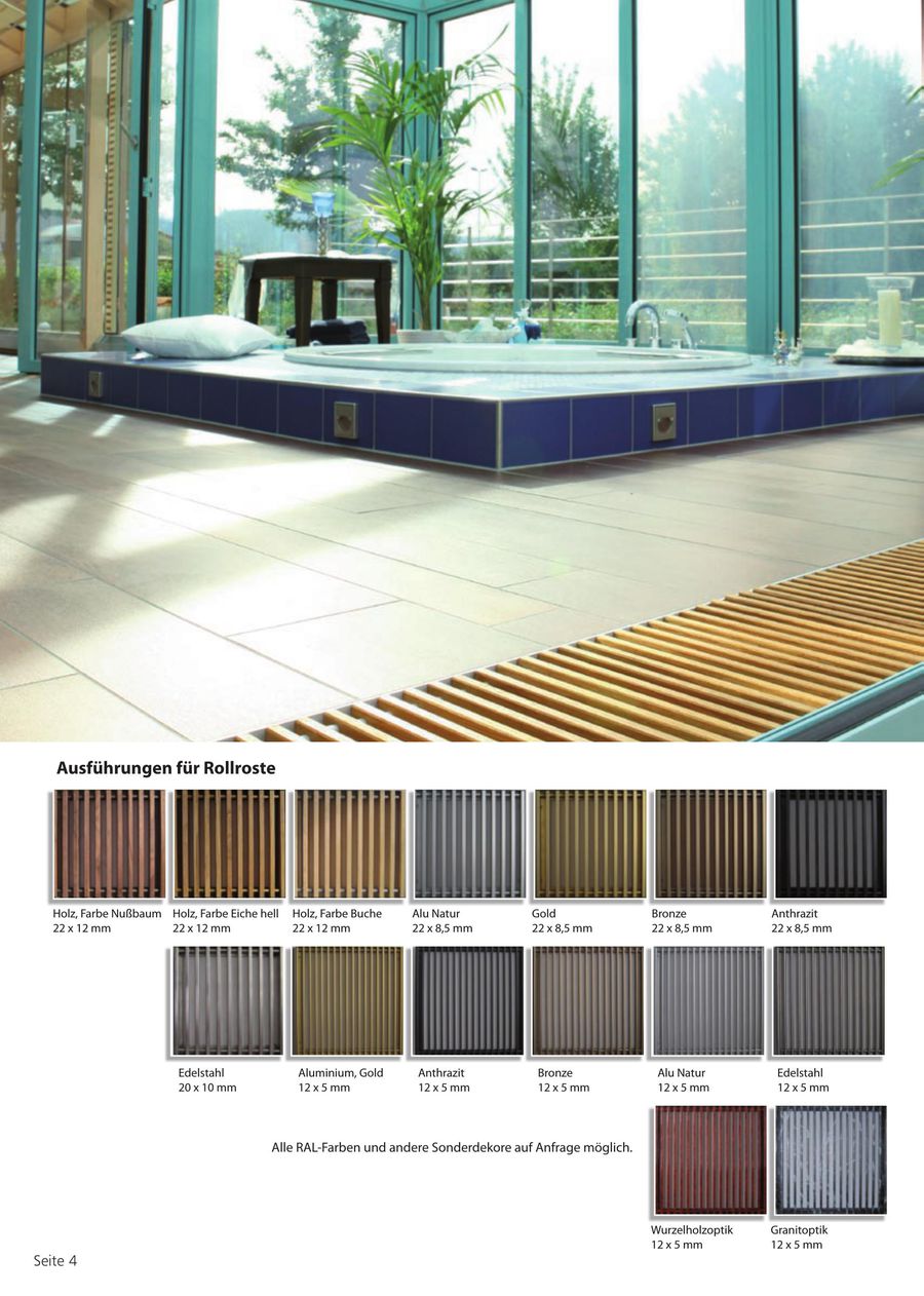 MEINERTZ Rollroste für die Abdeckung von Konvektorkanälen werden aus aerodynamisch geformten Aluminiumlamellen hergestellt, die von starken Stahlfedern mit stabilen AluminiumAbstandsbuchsen zusammengehalten werden Die Rollroste, die einen freien Querschnitt von 72% besitzen, werden standardmäßig in Winkelrahmen. Bremo führt begehbare Lineargitter oder Rollroste für die Abdeckung von Bodenkonvektoren Der Rahmen für die Aufnahme der Abdeckung besteht aus Aluminium Je nach Innenraumgestaltung oder Bodenbelag unterstreichen die Ausführungen in Aluminium, Chromstahl oder Holz die Ästhetik im Büro oder Wohnraum. Für den Ganzjahreseinsatz gebaut – höchst funktionell im Sommer wie im Winter Wasserführende Fußbodenheizung Doppelboden mit besonders vielen Konvektoren Thermische Barrieren an Schiebe und Hecktür.