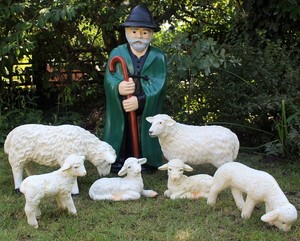 Gartenfiguren Schafer Stehend Mit 2 Schafen Und 4 Lammern Hirte H 94 Cm 7er Satz Ebay