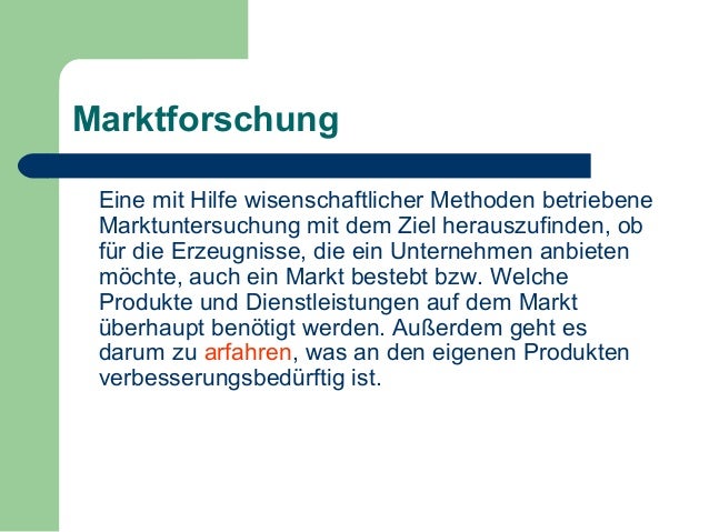 Beim Aufbau und Ablauf der Durchführung von Umfragen zum Zweck der Marktforschung sollte man auf einige Dinge achten, um diese so effektiv und zielgerichtet wie möglich zu gestalten Ziel und Gegenstand der Umfrageforschung festlegen Es kann viele Gründe für eine Umfrage geben, allerdings sollte man sich auf ein primäres Forschungsziel einigen. Mit der Dienstleistung Marktforschung prüft die sonar gmbh die Markteintrittsbarrieren für Ihr neues Produkt Wir führen eine Potentialanalyse durch und holen für Sie mit dem Konzept der primären Marktforschung ein qualifiziertes Feedback von Ihren potenziellen Kunden ab Sie stellen so sicher, dass vor einem teuren Produktlaunch der Markt eine erste Antwort geben kann, wie das. Marketing ist zudem ein sehr langfristiges Projekt, welches sich von der Marktforschung und Zielgruppenanalyse bis hin zum Vertrieb und dem Monitoring der Produkte und Strategien erstreckt Werbung ist lediglich eine kurzfristige Aufgabe, die sehr spezifisch angelegt ist Kurz gesagt ist Marketing nicht gleich Werbung, aber Werbung immer Marketing.