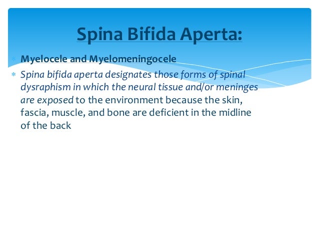 Spina bifida is a congenital condition If during fetal development the vertebrae don’t completely grow around the spinal cord, a part of the spinal cord is exposed, known as spina bifida While it is thought that spina bifida is an inherited condition, how this occurs has not been identified Environmental factors also play a role in the occurrence of spina bifida, for example, there being nutritional deficiencies during the pregnancy, maternal stress, as well as exposure to toxins. Spina bifida aperta (SBA), sometimes referred to as spina bifida cystica, is usually visible at birth as an exposed neural tissue with or without a protruding sac at the site ofthe lesion 137 in their 25year followup of 71 spina bifida aperta patients found that at least 75% of these children can be expected to reach their early adult years 137. Spina bifida aperta (SBA), sometimes referred to as spina bifida cystica, is usually visible at birth as an exposed neural tissue with or without a protruding sac at the site of the lesion SBA may be referred to as either myeloschisis (Figure 1 (a)) or myelomeningocele (Figure 1 (b)).