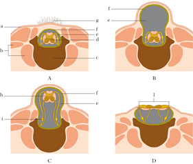 Spina bifida aperta (meningocele, meningomyelocele, myeloschisis) Anencephaly Spina bifida aperta In cases of spina bifida aperta, besides fissures of the osseous structures, one also finds abnormalities of the meninges and/or of the spinal cord itself The membranous covering can be present or absent.