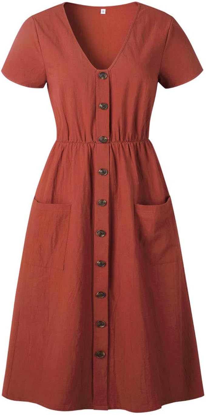 Klmslt Damen Sommerkleid Baumwolle Leinen Leger V Ausschnitt Knopfleiste Kurze Armel A Linie Midi Kleider Fur Frauen Amazon De Bekleidung