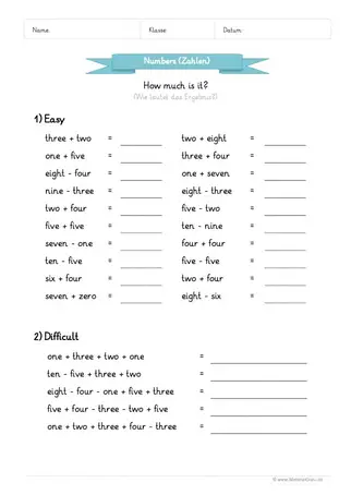 Kostenlose Arbeitsblätter und Übungen zum Thema "Zahlen / Numbers" für den EnglischUnterricht an der Grundschule zum Herunterladen als PDF Mehr dazu NEU Ein kostenloses EnglischArbeitsblatt zum Thema "Zahlen / Numbers" für die Grundschule, auf dem die Kinder rechnen sollen mit Zahlen von 012. 113 Zahlen größer als 1000 Sind die Zahlen größer als 1000, werden Zehnerund Einerzahlen durch einen Bindestrich verbunden und durch and an Hunderterund Tausenderzahlen angeschlossen Bei 1000 steht entweder der unbestimmte Artikel a oder das Zahlwort one Außerdem teilt man meistens jeweils drei Stellen von rechts durch Komma (,) ab Im Deutschen ist das auch üblich, allerdings. Du hast nun alle Zahlen kennengelernt Du kennst alle Einerzahlen, alle Zehnerzahlen, Hunderter, Tausender und die Million Mit den Übungen kannst du überprüfen, ob du die Zahlen im Englischen jetzt bilden kannst Wir wünschen dir viel Spaß und Erfolg dabei.