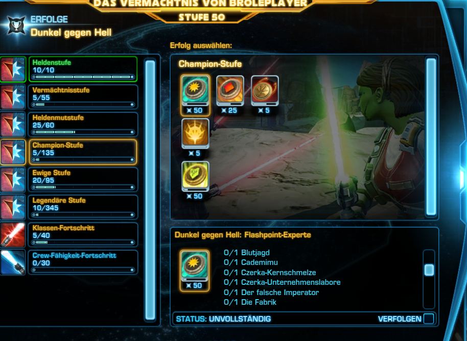 Am 28 Juni startet mit Kapitel 15 das „Dunkel gegen HellEvent“, welches sich bis in den Herbst zieht Auf der offiziellen Seite wurde ein Blog veröffentlicht, in dem ihr alle Informationen finden könnt Alle Helle oder DunkleSeite Entscheidungen der Spieler haben Einfluss darauf, welche Seite die Oberhand hat. Dieses HellDunkel Event seh ich daher positiv entgegen, ich kann die Story nochmal genießen und nebenbei Titel/Rüstungen/Pakete abstauben was zusätzlichen Anreiz bietet Glaube in Swtor geht Solo Raid noch nicht, aber wenn es soweit ist, und ich denke es kommt soweit, dann ist es echt nen Sologame. Achievement View for Dark vs Light Artifice, Category Events, SubCategory Dark vs Light, Tertiary Category Crew Skill Progression.
