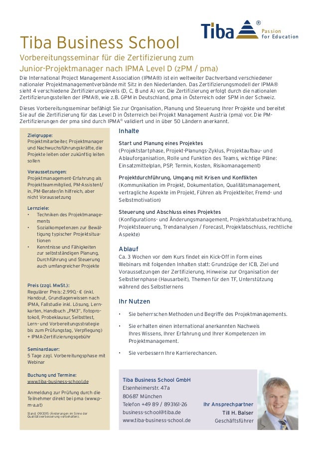 Projektmanagement Die Gesamtheit der Führungsaufgaben, organisation, techniken und mitteln für die Initialisierung, Definition, Planung, Steuerung und den Abschluss von Projekten;. He was certified as a Junior Project Manager IPMA Level D® in 16 Stephanie Fogel has been working at the in the University of Vienna’s Research Services Unit in the EU & International Funding team as an expert in both pre and postaward management of EU funded projects since 16. IPMA LEVEL D Sie verfügen über breites Wissen in Kompetenzen des Projektmanagements, können in Projektteams mitarbeiten und dort allenfalls spezifische Aufgaben des Projektmanagements übernehmen Weiter gehende Informationen als die unten stehenden finden Sie im Leitfaden zur Zertifizierung IPMA Level D.