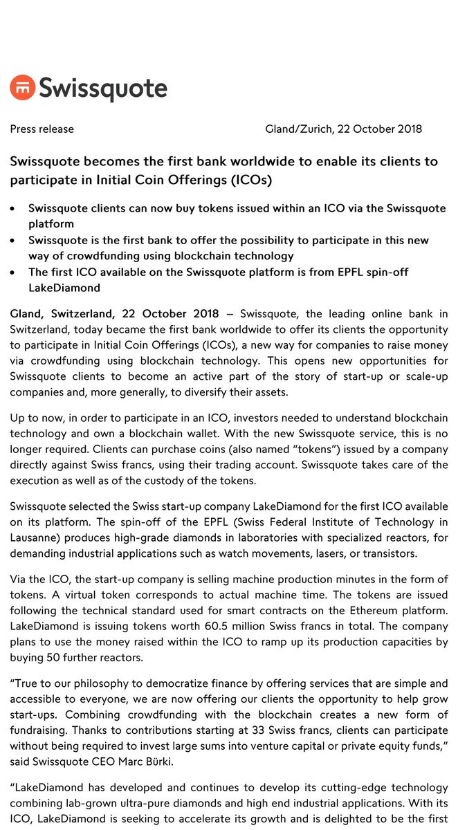 Lewis Dale Swissquote Becomes First Bank Worldwide To Enable Its Clients To Participate In Initial Coin Offerings Icos Blockchain Crypto Bitcoin Finance T Co Qwjwqmttww