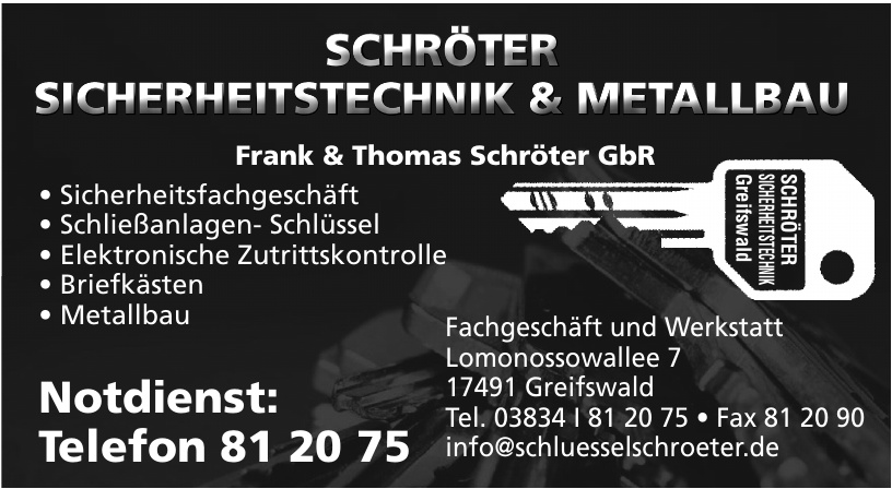 Schlüsseldienst für Greifswald 034 / 5194 oder 0176 / Ihr erfahrener SchlüsseldienstProfi für schnelle und günstige Türöffnung in Greifswald Seit über Jahren ist unser Schlüsselnotdienst auch am Wochenende und an Feiertagen rund um die Uhr erreichbar für Sie. Schlüssel nachmachen lassen Hallo, da ich nur einen einzigen Haustürschlüssel für meine Mietwohnung habe, möchte ich gerne einen zweiten au – Studis OnlineForum. Neben fachgerechten Türöffnungen, fairen Preisen und einen schnellen 24StundenService bieten wir Ihnen eine kompetente Sicherheitsberatung direkt bei Ihnen vor Ort.