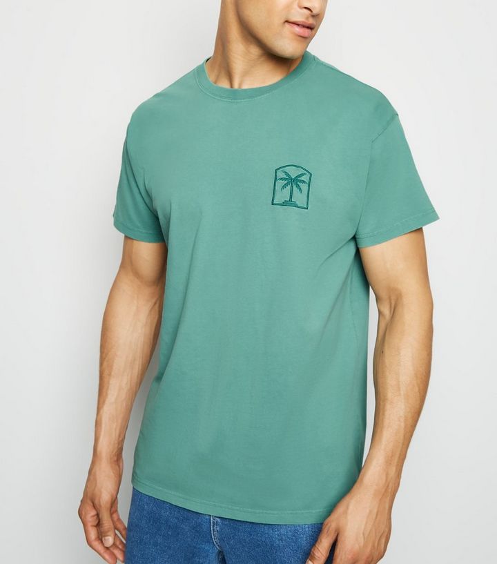Grunes T Shirt Mit Palmen Logo Und Ausgewaschener Optik New Look