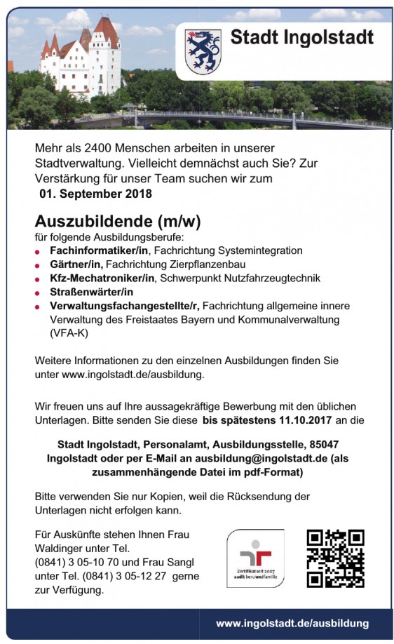 Seit nunmehr 85 Jahren ist es unserem Unternehmen ein Auftrag, Sie als Kunden unseres Hauses Willkommen zu heißen Ein Unternehmen, das mit der Stadt Ingolstadt, seinen Menschen und der Audi AG historisch verknüpft ist und über eine hohe Reputation verfügt Wir sind Ihr kompetenter Ansprechpartner für Audi, VW, SEAT und Skoda. Finden Sie jetzt 31 zu besetzende Stadt Ingolstadt Jobs in Ingolstadt auf Indeedcom, der weltweiten Nr 1 der OnlineJobbörsen (Basierend auf Total Visits weltweit, Quelle comScore). Die Stadt Ingolstadt bildet regelmäßig in über 15 verschiedenen Berufen in der Verwaltung sowie in handwerklichen, gewerblichen, technischen und sozialen Berufen aus Derzeit befinden sich bei der Stadt Ingolstadt 130 junge Menschen in einer Ausbildung oder einem Studium Welche Berufe im nächsten Ausbildungsjahr angeboten werden, geben wir in der espresse sowie auf diesen.