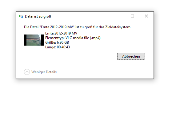 Hallo zusammen, hat jemand eine Idee, was ich tun kann, wenn ich beim Versuch etwas auf einen USBStick zu kopieren, der definitiv genug Platz hat, stets nur die Meldung bekomme "Objekt kann nicht kopiert werden, da es für das Volumeformat zu groß ist"?. In Windows 10 Support um eine Lösung zu finden;. Ich versuche einen Videofilm (4,74Gb) auf einen USB stick zu kopieren es geht nichtes kommt die Meldung Datei zu groß obwohl ich es schon mit einem ( 32Gb ) versucht habeder Film hat eine Länge von 31,29 min für eine Antwort wäre ich dankbar Walter Henseler.