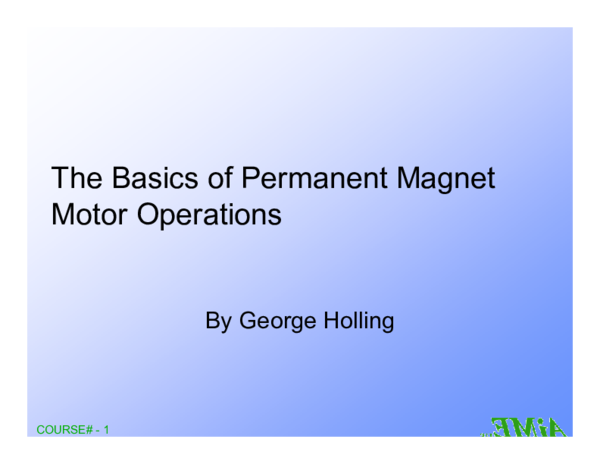 The invention is directed to the method of utilizing the unpaired electron spins in ferro magnetic and other materials as a source of magnetic fields for producing power without any electron flow as occurs in normal conductors, and to permanent magnet motors for utilizing this method to produce a power source In the practice of the invention the unpaired electron spins occurring within. Permanent Magnet “Brushless DC” Motors ∗ JL Kirtley Jr 1 Introduction This document is a brief introduction to the design evaluation of permanent magnet motors, with an eye toward servo and drive applications It is organized in the following manner First, we describe three different geometrical arrangements for permanent magnet. Brushless, permanent magnet motor system provides a very high torque to inertia ratio Figure 3 shows radial and axial field permanent magnet motors Figure 3 Schematics of radial field and axial field permanent magnet motors C Permanent Magnet Materials Figure 4 summarizes the four most common permanent magnet materials used today by motor.