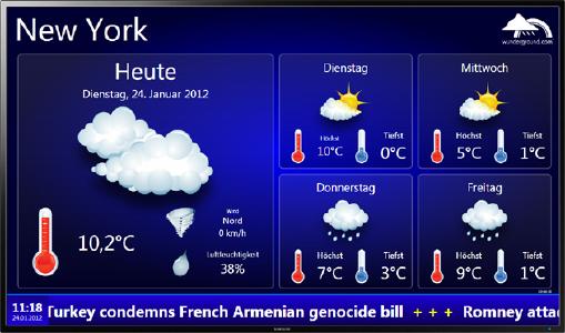 FrontFace for Public Displays and FrontFace for Touch Kiosks include an integrated weather chart module that can show the current weather conditions and a 3day forecast for any place on earth The data source for this module is Weatherundergroundcom (a. However, the most significant change is that both the primarily noninteractive features of FrontFace for Public Displays and, soon, the interactive touchmenu capabilities of FrontFace for Touch Kiosks will be available in one single productThus, bothclassic digital signage applications, and interactive kiosk systems, as well asmixed types of both, can be implemented with a single, powerful. Existing customers of FrontFace for Public Displays or FrontFace for Touch Kiosks can upgrade for free to the new FrontFace 4, if they are eligible for updates & support For prospects, there is a free, fully functional trial version available as well as quickstart tutorials, including one for the new, interactive functions!.