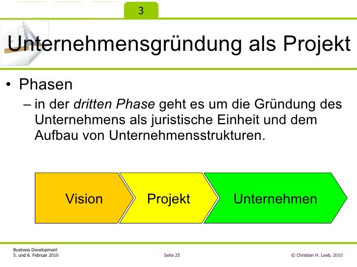 Treten Sie mit der Behörde in Kontakt bevor Sie bauliche Maßnahmen treffen, damit es nachher nicht zu bösen Überraschungen kommt Standort Für manche Betriebe ist der geeignete Standort von großer Bedeutung Machen Sie sich Gedanken darüber, ob der von Ihnen gewünschte Unternehmensstandort auch der richtige ist Rechtsformen. Phasen einer Unternehmensgründung Der Weg in die Selbständigkeit und die Gründung eines Unternehmens vollzieht sich meist in drei unterschiedlichen Phasen, die aufeinander aufbauen In der Orientierungsphase werden Geschäftsidee und die hierzu erforderlichen Voraussetzungen analysiert und optimiert. Diese Phasen der Unternehmensgründung dienen nur der Ordnung von Prozessen Praktisch findet sich der Unternehmer auch nach Jahren wieder bei Tätigkeiten, die in die Vorgründungsphase gehören Am Ende einer erfolgreichen Unternehmerlaufbahn stellt sich der Unternehmer wieder ähnliche Fragen wie der Gründer.