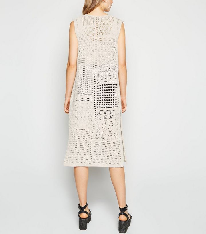 Cremeweisse Lange Strickjacke In Hakeloptik Ohne Armel New Look