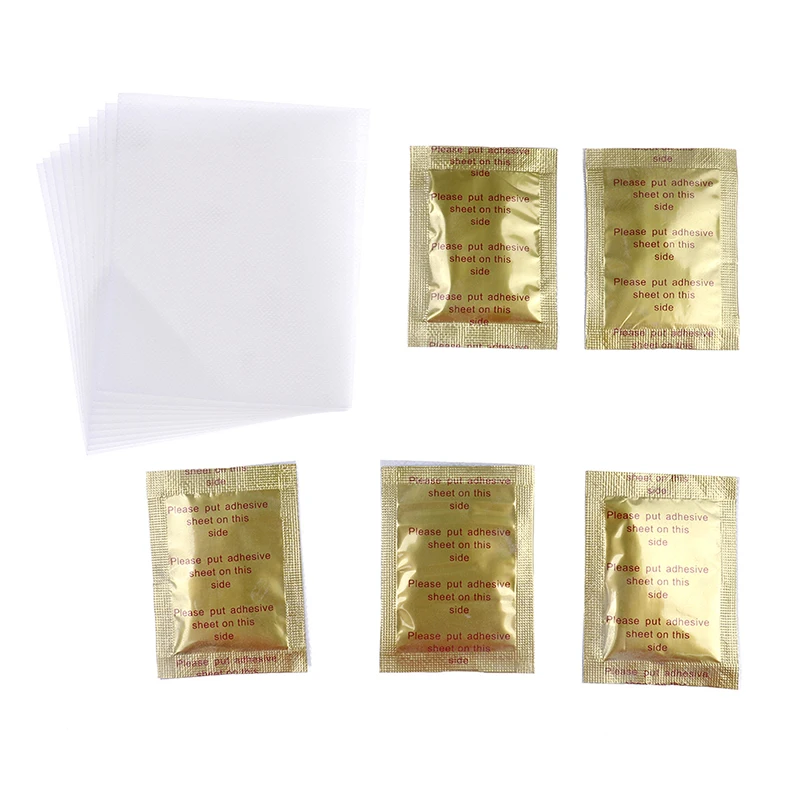 2 Cut Hotfix Adhesive™ Sheet to match the size of your fabric 3 Place Hotfix Adhesive™ side up Printed side down on Ironing board ( This side down HotfixAdhesivecom) 4 Place fabric on top of Hotfix Adhesive™ Press the Iron straight down for approximate 1015 seconds This will anchor the fabric and Hotfix Adhesive™. 3Place the foot pad on the adhesive where noted to "Put adhesive sheet on this side" and place onto the soles of your feet or the desired area of other body part (Socks can be worn if necessary) 4Wear for 810 hours then remove pad. Remove the sticky paper, and then slowly peel off the paper Place the gasket on the adhesive that says "Place the adhesive sheet on this side" and then put it on the neck Remove the pad after 810 hours Use a damp towel to wipe the body parts of the body until they are no longer sticky.