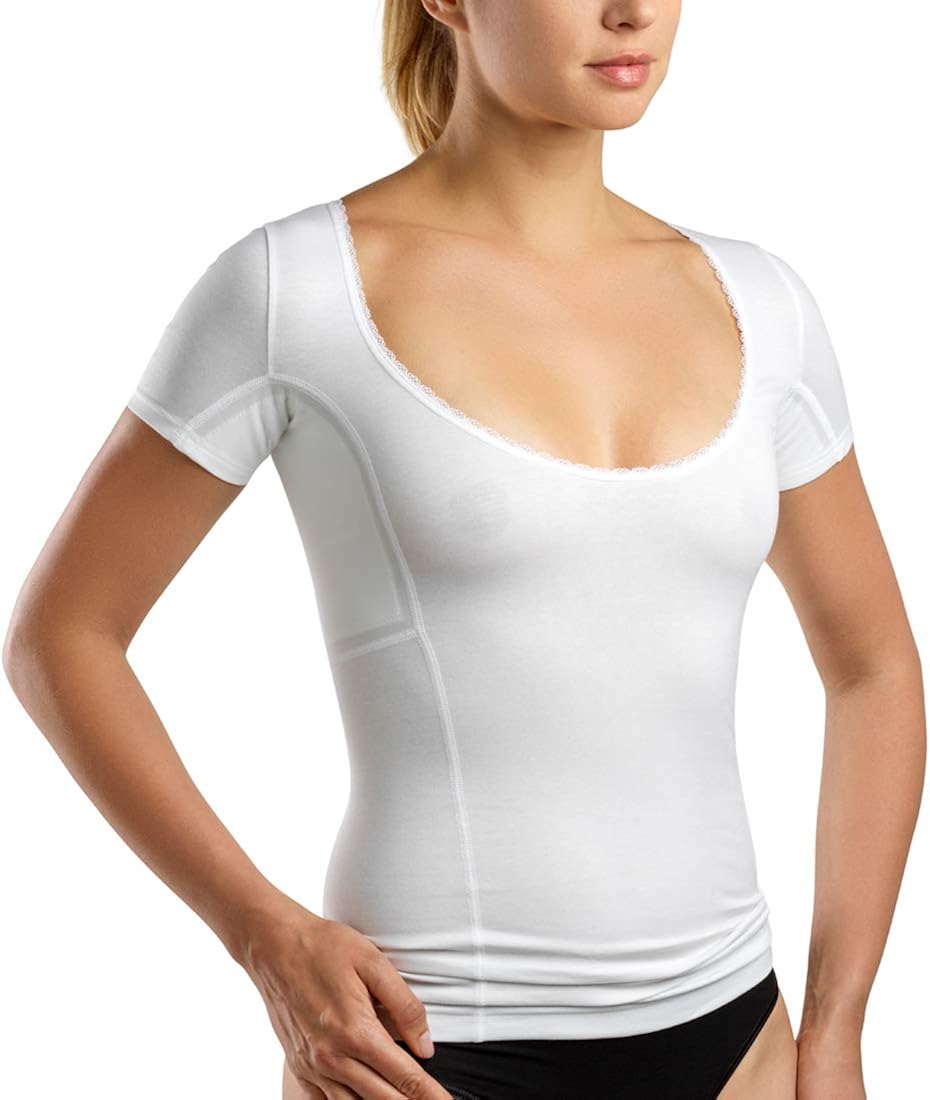 The Thompson Tee Damen Anti Schweiss Kurzarm Unterhemd Mit Anti Mikrobiellen Achselschweiss Polstern Normale Passform U Ausschnitt Amazon De Bekleidung