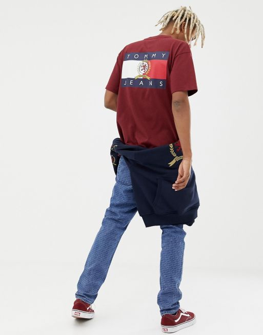 Tommy Jeans 6 0 Limited Capsule Burgunderrotes T Shirt Mit Rundhalsausschnitt Und Flaggen Logo Hinten Asos