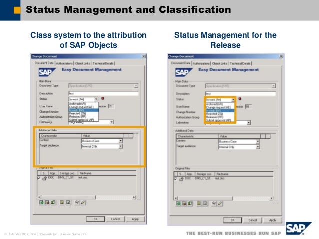 Easy DMS is a document management system used to track, manage and store documents and reduce paper It's capable of keeping a record of the various versions created and modified by different users (history tracking) Easy DMS is available as a separate plugin for Easy Redmine It is aimed to extend the current Easy Redmine's Documents module. This webinar will discuss how many companies are taking advantage of the robust document management capabilities of SAP software that they already own Learn. This is an example of SAP custom solution for document management I use it as a custom documentation repository It makes tutorial materials available to al.