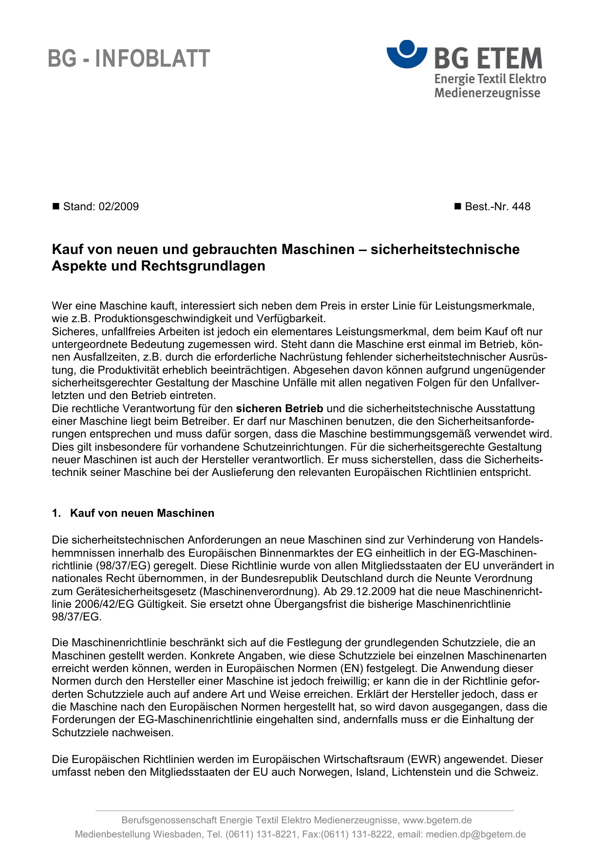 Aufbewahrte technische Unterlagen durch die Prüf und Zertifizierungsstelle des Fachbereiches Verkehr und Landschaft gemäß der Maschinenrichtlinie 06/42/EG DGUV TestInformationen Hinweise zur Nutzung der Internetdatenbank "Zertifizierte Produkte" (PDF, 692 kB). Die neue Maschinenrichtlinie 06/42/EG Am 09 Juni 06 wurde die neue MaschinenRichtlinie (MRL) 06/42/EG als Nachfolger für die kodifizierte Richtlinie 98/37/EG im Amtsblatt der Europäischen Union veröffentlicht und trat am 29 Juni 06 in Kraft Dies bedeutet aber nicht, dass sie heute bereits angewendet bzw erfüllt werden muss. A second publication of the Machinery Directive took place in 1998 – Directive 98/37/EC of 22 June 1998 on the harmonisation of the laws of all Member States relating to machinery This directive is the codified version of Directive /392/EEC as amended by the directives listed above.