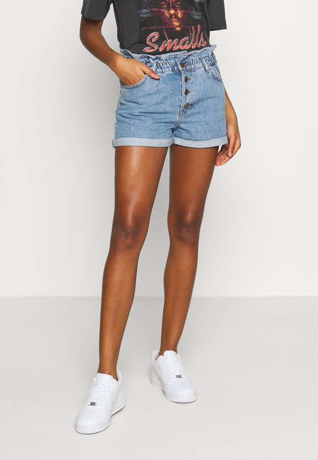 Blau Schleife Taschen Gurtel Hohe Taille Kurze Jeans Hose Damen Paperbag Hose Hotpants Shorts Unterteile