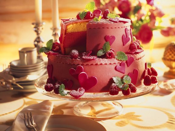 Zweistockige Himbeertorte Mit Marzipanherzen Verziert Rezept Eat Smarter