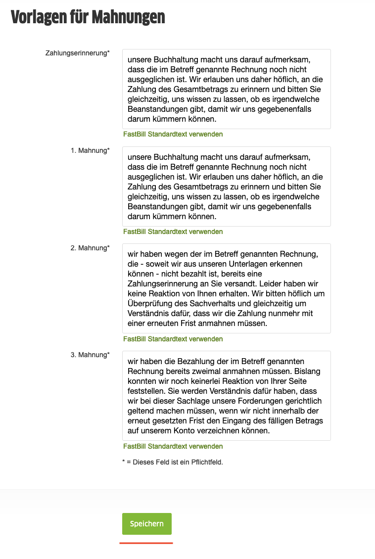 Mahnungstext Mahnungsvorlage Anpassen Fastbill Support