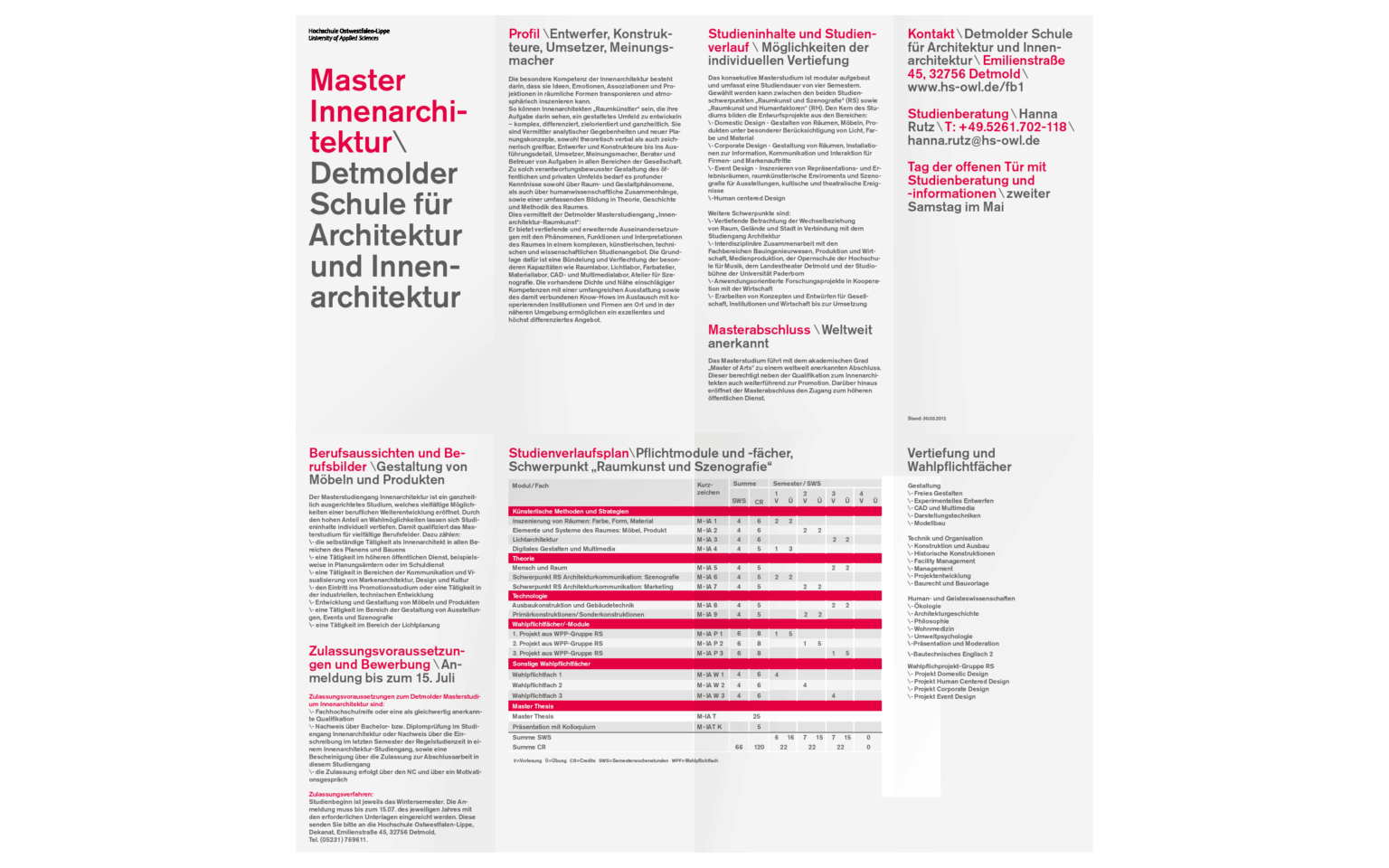 Die außergewöhnliche Größe der Detmolder Schule mit 36 Professoren und Professorinnen (für die Studienrichtungen Innenarchitektur, Architektur, Stadtplanung) eröffnet den Studierenden ein vielfältiges Angebot und eine großzügige Auswahl an Wahlfächern und Seminaren. PerceptionLab Forschungsschwerpunkt Hochschule OstwestfalenLippe Fachbereich 1 Detmolder Schule für Architektur und Innenarchitektur Emilienstr 45, Detmold Gebäude 4 (Bülowblock), Raum 4212 Anfahrt. Auswahlverfahrenssatzung für die Masterstudiengänge Architektur und InnenarchitekturRaumkunst vom 27 Juni 11 Master Prüfungsordnung vom 13 Januar 12 Gültig für alle aktuell eingeschriebene Studenten im Studiengang Master InnenarchitekturRaumkunst NEUMasterprüfungsordnung InnenarchitekturRaumkunst vom 0917.