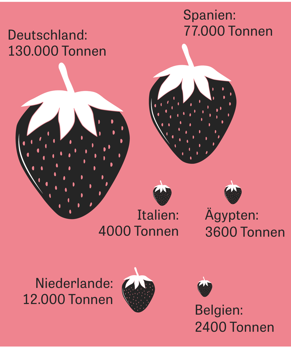 Oft sind sie auch weniger schadstoffbelastet Von Februar bis Mai sind Früchte aus Spanien und Italien erhältlich Um die Weihnachtszeit kann man Erdbeeren aus Marokko und Ägypten kaufen Es lohnt sich aber, auf die heimische Saison im Frühsommer zu warten Lagerung Sensible Früchtchen Erdbeeren sind äußerst empfindlich. Erdbeeren aus Andalusien Nur bedingt zum Reinbeißen Ein Drittel der Früchte, die in Europa angebaut werden, wachsen in der spanischen Region Die Plantagen saugen dem Schutzgebiet Doñana das. Die Erdbeerkörbchen in deutschen Supermärkten kommen meist aus Spanien Dort verdienen die Landwirte mit den ExportFrüchten gutes Geld Doch die Umwelt vor Ort zahlt dafür einen hohen Preis.