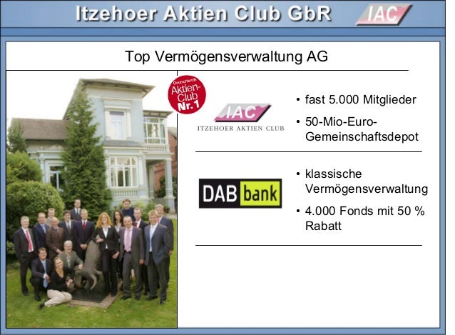 Itzehoer Aktien Club GbR, Ein Monat, zwölf Städte – mit der Seminarreihe „AKTIEN für ALLE“ ist Depotmanager Martin Paulsen vom Itzehoer Aktien Clu. Mit über 7000 Investoren ist der Itzehoer Aktien Club (IAC) die größte Anlegergemeinschaft dieser Art in Deutschland Seit seiner Gründung in 1998 verfolgt. Über den Itzehoer Aktien Club (IAC) Gegründet 1998, ist der Itzehoer Aktien Club ( wwwiacde) mittlerweile mit mehr als 3000 eingetragenen Mitgliedern und einem Depotvolumen von mehr als 50 Millionen Euro der mit Abstand größte Aktienclub in der Bundesrepublik Deutschland Ziel des Itzehoer Aktien Clubs (IAC) ist die Förderung der.