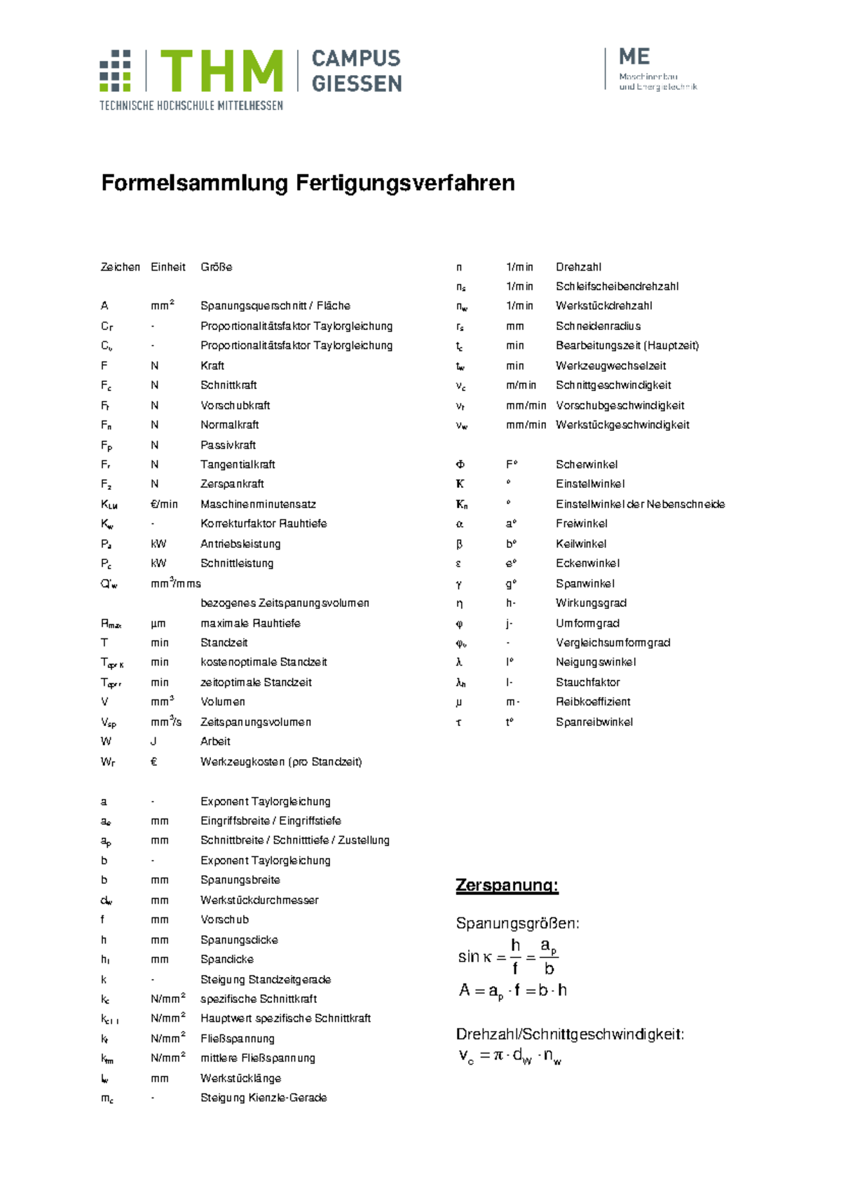 Formelsammlung Zu Fertigungsverfahren 2 Studocu