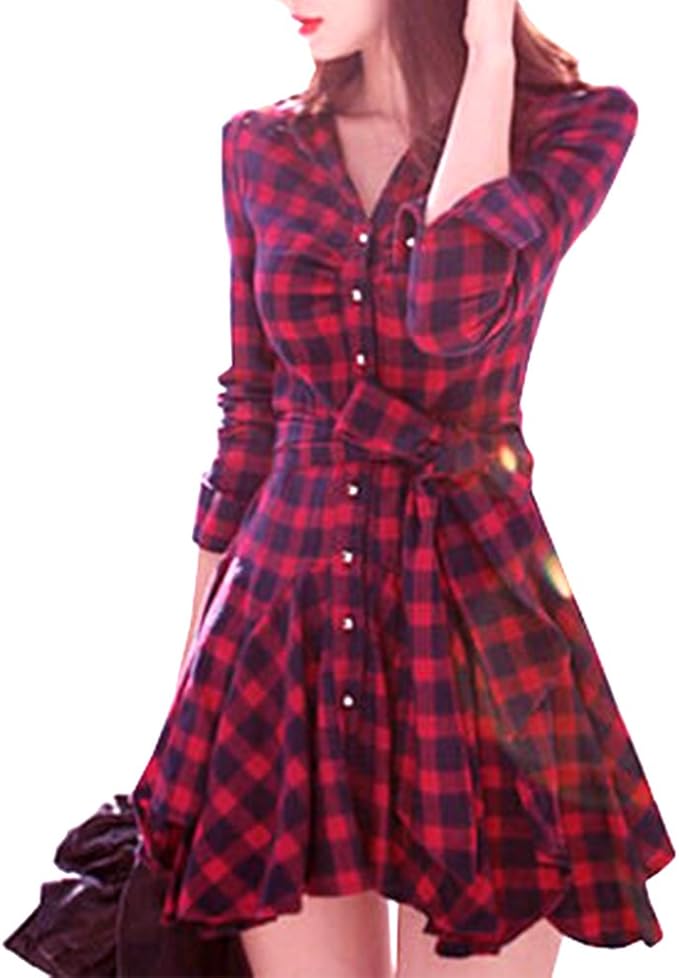 Eleery Damen Dunne Langarm V Ausschnitt Tunika Lange Shirt Kariert Hemd Plaid Shirt Plaids Tops Bluse Mini Kleid Amazon De Bekleidung