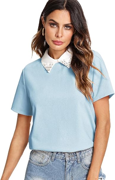Romwe Damen Kurzarm T Shirt Mit Kragen Rusche Volant Top Oberteil Amazon De Bekleidung