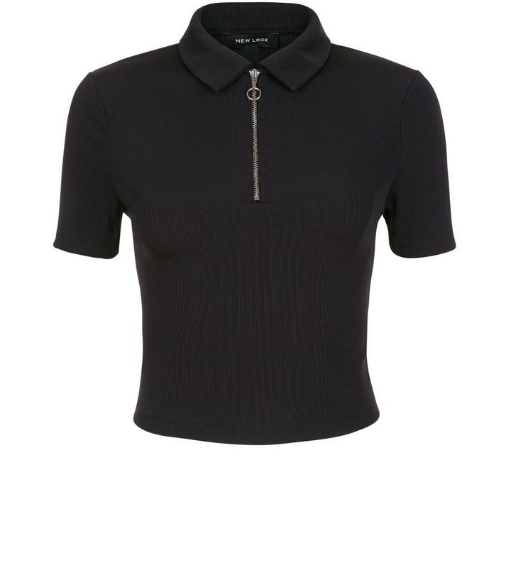 Schwarzes Geripptes T Shirt Mit Reissverschluss Vorn Und Kragen New Look
