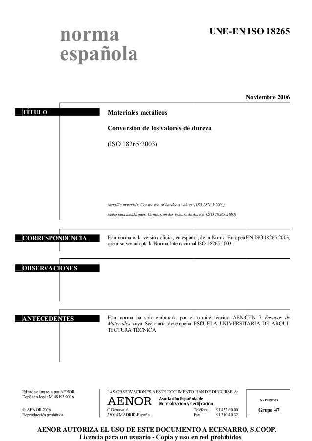 Purchase your copy of BS EN ISO as a PDF download or hard copy directly from the official BSI Shop All BSI British Standards available online in electronic and print formats BS , ISO 621, DIN 170, TGL , ISO , ISO 4964, ISO 4957, ISO International Relationships ISO ,EN ISO. NF A, NF EN ISO 165 EQV Tercüme Edildiği STD EN ISO 165 ICS Kodu Metallerin Mekanik Muayenesi Atıf Yapılan STD TS 1391 EN. English price group 23 wwwdinde wwwbeuthde 0604 =P EN ISO 165 November 03 ICS English version Metallic materials Conversion of hardness values (ISO 165 03) Matériaux métalliques – Conversion des valeur de dureté (ISO 165 03) Metallische Werkstoffe – Umwertung von H?rtewerten (ISO 165 03) This European Standard was approved by CEN on.
