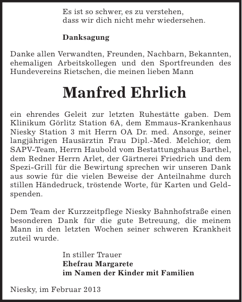 Manfred Ehrlich Danksagung Sachsische Zeitung