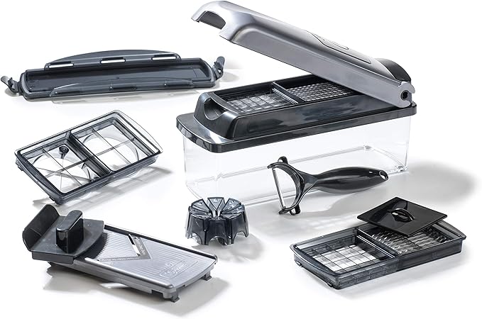 Amazon De Genius Nicer Dicer Plus 12 Teile Gemuseschneider Zwiebelschneider Pommesschneider Obstschneider Allesschneider Wurfeln Stifteln Schneiden Schalen Aufbewahren A Silber Schwarz