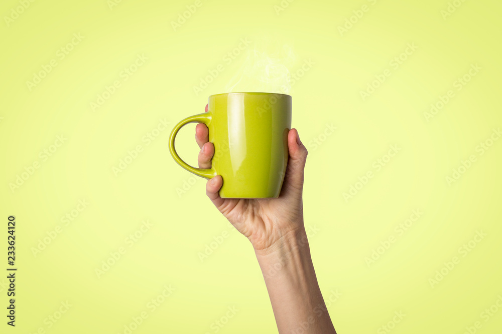 Gemalde Auf Glas Tee Female Hand Holding A Green Cup With Hot Coffee Or Tea On A Light Green Background Breakfast Concept With Hot Coffee Or Tea Nikkel Art De