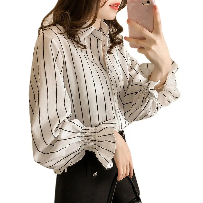 Guido Maria Kretschmer Curvy Collection Striped Blouse Casual Ladies Blouse Shirt With Turn Down Collar White