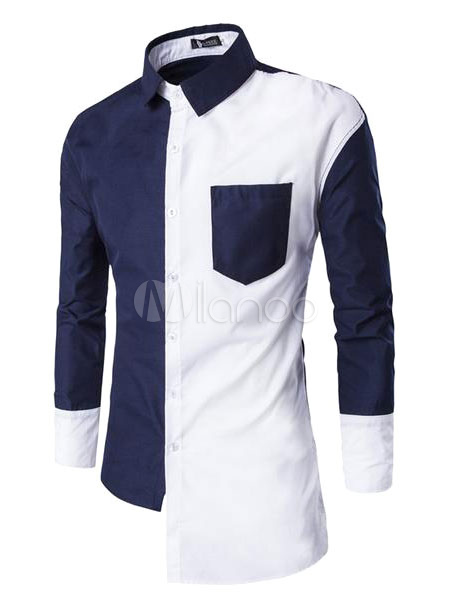 Farbe Block Manner Turn Down Kragen Langarm Pocket Button Down Hemd Unregelmassige Gespleisst Milanoo Com